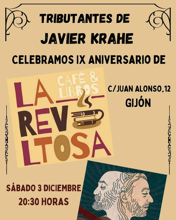 Hacia tiempo que no teníamos conciertos en La Revol. Cuando allá por julio, en Semana Negra, el bueno de Rober nos habló de un grupo que tenía con unos amigos y que rendía tributo a nuestro admirado Javier Krahe, supimos que sería un concierto perfecto para nuestro aniversario.