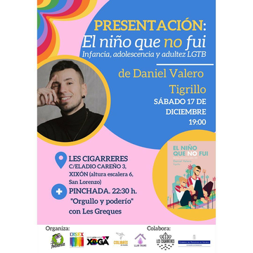 El próximo sábado Daniel Valero @tigrilloig visita Asturies, concretamente Xixón, para presentarnos su libro ''El niño que no fui. Infancia, adolescencia y adultez LGTB'' en un encuentro que tendrá lugar en el nuevo bar socio-cultural Les Cigarreres.