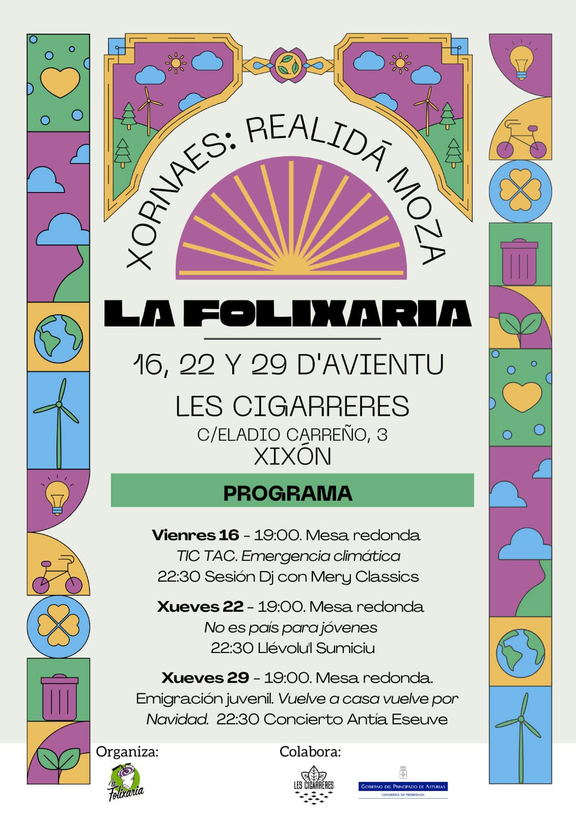 Este mes, desde la Folixaria organizamos estas jornadas en Xixón enfocadas a tratar temas que atraviesan la realidad de la juventud en Asturies, como la crisis climática, la precariedad laboral, el acceso a la vivienda, la salud mental o la emigración y el éxodo juvenil.