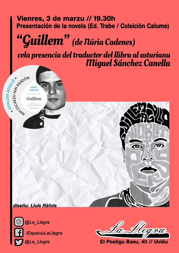 Esti vienres, 3 de marzu, a les 19.30 hores, va presentase nel Espaciu La Llegra'l sestu títulu de la colección Calume d'Ediciones Trabe, la novela 'Guillem' de Núria Cadenes.