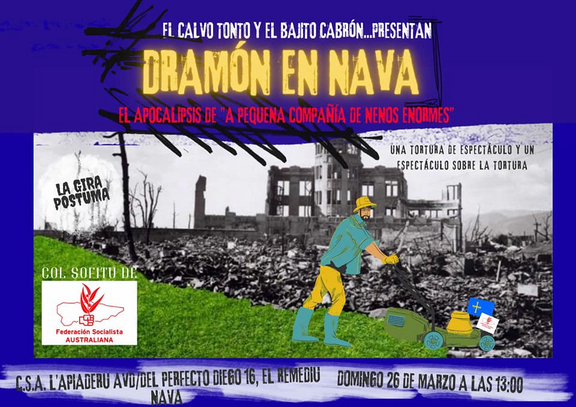 Tamos enchides por ser partícipes de la xira "Dramón na vida" d'A Pequena compañía De Nenos Enormes; y desolaes, sí, desolaes por ser la xira de despedida. ¿De verdá cuntáis nun venir? Va ser esti domingu 26 a eso de la una la tarde y n'acabando, comida de traxe coles artistes, pa poder criticales "constructivamente".