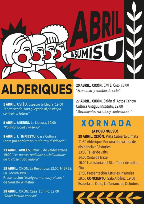Conformá por coleutivos de trabayaores, centros sociales, conceyos populares y organizaciones d'esquierdes, Asturies Insumisa entama'l so camín con unes xornaes que se van esparder per tol mes d'abril y que finarán nun actu presentación pal 29 d'abril, previu al 1u de Mayu.
