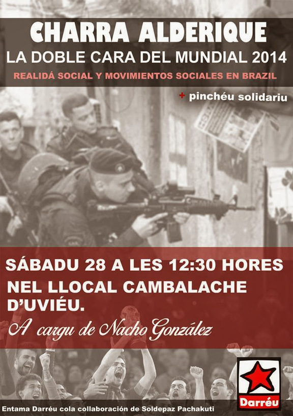 Esta actividá vamos desendolcala nel Llocal Cambalache d'Uviéu (C/Martínez Vigil, 30, baxu) de magar les 12:30 y el principal atractivu sedrá una charra-alderique col llema "la doble cara del Mundial 2014: realidá social y movimientos sociales en Brazil". La charra va tar protagonizada por Nacho González, compañeru de Soldepaz Pachakuti especializáu nel contestu brasileñu y les lluches que se tan dando n'America Llatiana. Solliñar amás que los compañeros de Soldepaz Pachakuti d'Asturies tuvieron nel Congresu que'l MST (Movimientu de los Trabayadores Rurales ensín Tierra) cellebró en febreru.