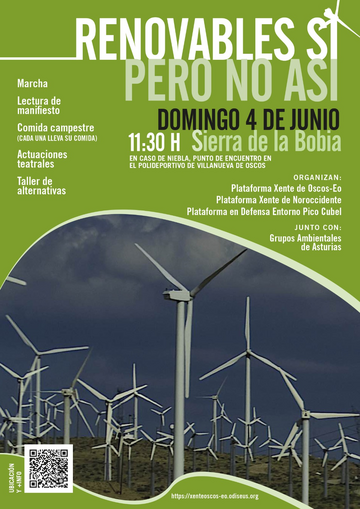 Y el domingo 4 de junio, víspera del día internacional del medio ambiente, nos vamos a la Bobia, donde nos manifestaremos junto a otros grupos ambientales de Asturias, bajo la pancarta de "Renovables sí, pero no así" ya mítica, grupos ambientales que se solidarizan contra la invasión de polígonos eólicos que sufre el occidente asturiano y, por ende, Galicia, territorios de sacrificio para las manos extractivistas.