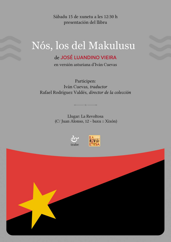 Esti sábadu 15 de xunetu a les 12:30 hores va facese en La Revoltosa, libros y café la primer presentación de 'Nós, los del Makulusu', la novela de José Luandino Vieira que traduxo al asturianu Iván Cuevas y que ye l'octavu títulu de la colección Calume d'Ediciones Trabe.