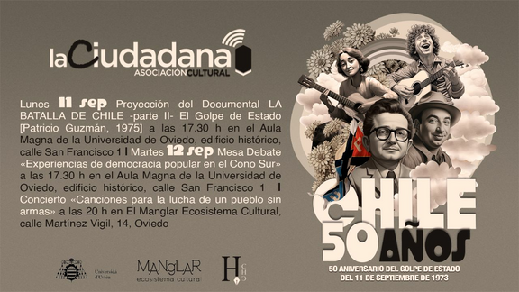 El 11 de septiembre de 1973 un golpe de estado militar, encabezado por el traidor general Augusto Pinochet, acababa con una experiencia única de socialismo democrático, peleada desde las urnas y las instituciones. El gobierno de la Unidad Popular presidido por Salvador Allende, el compañero Presidente, sucumbía al bombardeo de la Moneda, en Santiago de Chile. 50 años después recordamos desde La Ciudadana aquellos acontecimientos históricos, que devinieron en el fin de miles de vidas, entre ellas la del Presidente Allende, violaciones flagrantes de los Derechos Humanos y una dictadura feroz y duradera dirigida por el traidor general, que utilizó el monopolio de las armas contra las aspiraciones de libertad e igualdad de su propio pueblo. En dos jornadas, 11 y 12 de septiembre, trataremos de analizar lo ocurrido, proyectarlo sobre nuestra propia realidad política y la actualidad de la situación en el Cono Sur latinoamericano y celebrar, además, las ricas expresiones artísticas de cultura popular. Cabe recordar que estos días han sido condenados, después de 50 años, los asesinos de Víctor Jara en la masacre del Estadio Nacional de Chile. Esperamos que nos acompañéis en este homenaje a la Unidad Popular y las ansias de democracia, libertad e igualdad de los pueblos.