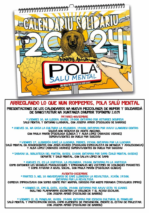 Dientro de la so campaña pola salú mental, Banksy Astur entama una serie d'alcuentros para presentar el calendariu de 2024 y concenciar sobre una problemática qu'afecta a cada vez más persones. Dientro d'una ronda d'eventos que van percorrer toa Asturies, enmárcase'l que se va llevar a cabu na nuesa casa, nel que'l psicólogu especialista n'infancia y adolescencia Jesús Rivero y Alba López, de l'Asociación Abrazos Verdes, van averanos a la realidá pospandémica de la salú mental de la xente más mozo.