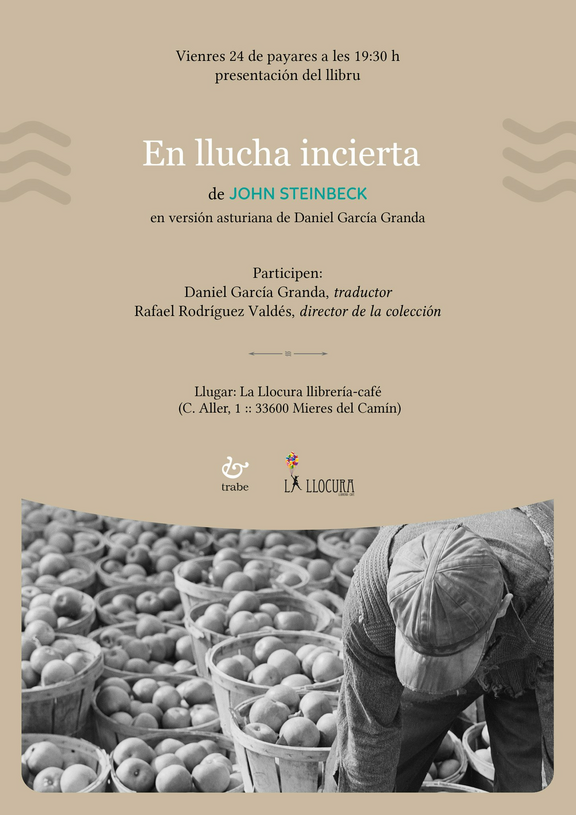 Esti vienres 24 de payares a les 19:30 hores vamos presentar en La Llocura Llibrería-Café la novela 'En llucha incierta' de #johnsteinbeck traducida al asturianu por Daniel García Granda pa la colección Calume d'Ediciones Trabe.