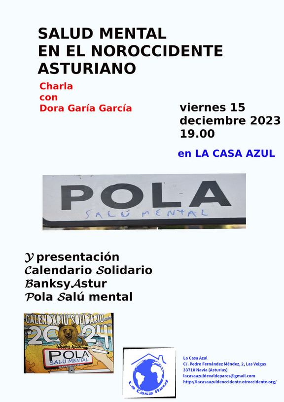 Saludos a todxs: Y para despedir el año, desde La Casa Azul os proponemos participar en una charla sobre la salud mental en el Noroccidente asturiano.