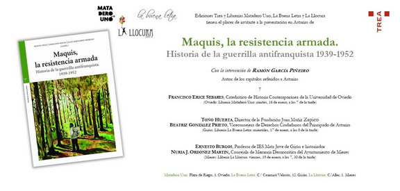 Durante esta semana se llevará a cabo la presentación en Oviedo (librería Matadero Uno, martes 16, 7 de la tarde), Gijón (librería La Buena Letra, miércoles 17, 8 de la tarde) y Mieres (librería la Llocura, viernes 19, a las 7, 30 de la tarde) de la obra Maquis, la resistencia armada, con la participación en todas ellas de Ramón García Piñeiro, autor de los capítulos referidos a Asturias, y la intervención de Francisco Erice, Toño Huerta, Beatriz González Prieto, Ernesto Burgos y Nuria Ordoñez Martín.