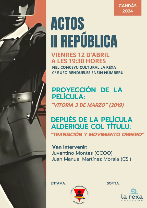 Esti vienres 12 d'abril, a les 19:30 hores, en colaboración cola Asociación Republicana Cristino García, proyectamos la película "VITORIA 3 DE MARZO".