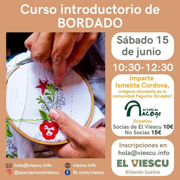 El curso lo impartirá Ismelita Cordova, de @asturiasacoge . Comenzaremos por una sesión donde aprenderemos diferentes puntadas y técnicas de bordado. También podremos aprender a patronar dibujos. Y gracias al entorno donde se desarrollará el taller, tendremos muchas plantas y flores que nos pueden servir de inspiración. Si se forma grupo, sería posible realizar más sesiones durante el verano.