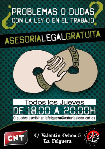 La CNT de la Felguera ofrece una asesoría laboral para todos los trabajadores (afiliados o no) los jueves de 18h a 20h.
