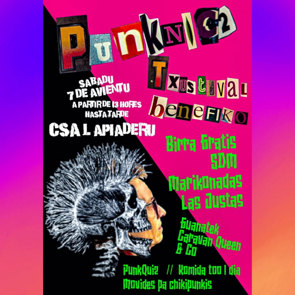 Por fin llega el evento más esperado del año!! Nuestro segundo PUNNKKNIC !! Una vez más os necesitamos para seguir en Ronzón... Y este año tendremos muchas sorpresas, sorteos, conciertos, pintxadas, juegos para txikipunkis, un taller de maquillaje punk, nuestro ya tradicional punkuizz...y muchas cosas más!!! Así que ven a celebrar con nosotras!!