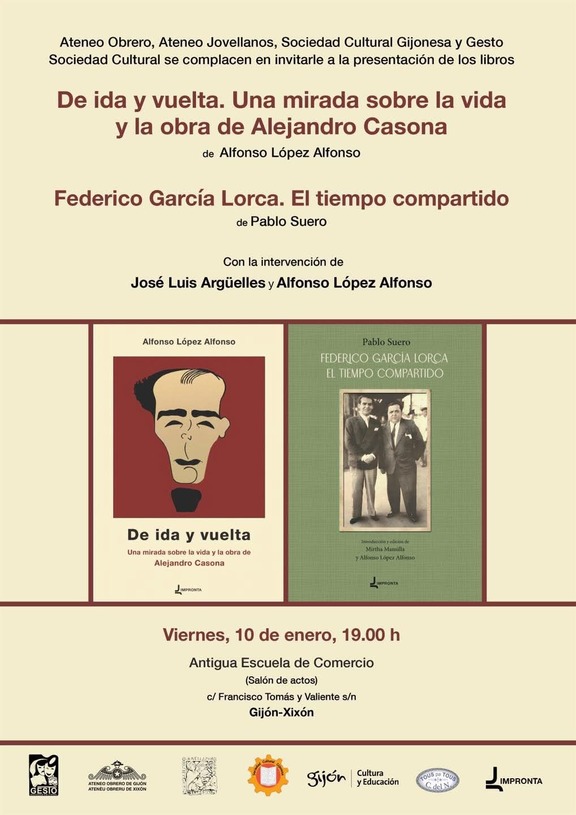 Como apertura del año cultural 2025 en nuestra ciudad, el próximo viernes 10 de enero, a las 19:00 horas en el Salón de Actos de la Escuela de Comercio, las cuatro asociaciones de referencia en este ámbito, Ateneo Jovellanos, Sociedad Cultural Gijonesa, Gesto Sociedad Cultural y Ateneo Obrero de Gijón, organizan conjuntamente un acto que tiene como protagonistas a dos nombres mayores de la literatura y del teatro españoles del siglo XX: Alejandro Casona y Federico García Lorca. Dos autores que renovaron la escena española de su tiempo y cuyas trayectorias vitales y artísticas coincidieron en más de un punto, igual que ocurrió con la del periodista argentino de origen gijonés Pablo Suero. Dos libros de reciente publicación han contribuido a traerlos a la actualidad, gracias al gran trabajo del investigador Alfonso López Alfonso. El acto tendrá formato de entrevista abierta al público, que realizará el poeta y periodista José Luis Argüelles al propio Alfonso López Alfonso, autor de De ida y vuelta. Una mirada sobre la vida y la obra de Alejandro Casona (la monografía definitiva sobre el autor de Besullo, de reciente publicación) y también editor literario, junto a Mirtha Mansilla, de Federico García Lorca, el tiempo compartido, que reúne textos que el periodista Pablo Suero (Gijón, 1898-Buenos Aires, 1943) escribió sobre García Lorca entre 1933 y 1938. Sus intervenciones se complementarán con la proyección de fotografías (muchas de ellas desconocidas hasta ahora, de Casona, Lorca y Suero) y la audición de un texto, leído en Buenos Aires por el propio Casona, sobre Federico García Lorca antes de su regreso a España en 1962.