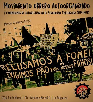 El martes 4 de marzo, a las 19:00h, en el CSA La Xusticia en La Felguera, charla: Movimiento obrero autoorganizado y experiencias de autogestión en la Revolución Portuguesa (1974-1975). Con Miguel Pérez (historiador)