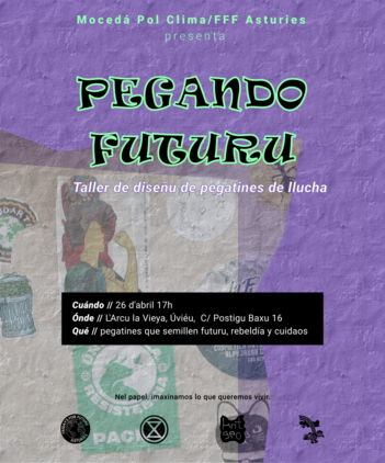 Vémonos el 26 d'abril a les 17h en L'Arcu la Vieya (Úviéu), C/ Postigu Baxu 16. El taller ta organizáu por Mocedá Pol Clima / Fridays for Future Asturies y XR Asturies, en collaboración con AK Kritische Geographie Bonn (del Rinlandia). Ta abiertu a toles persones con ganes de crear y compartir futuros más xustos.