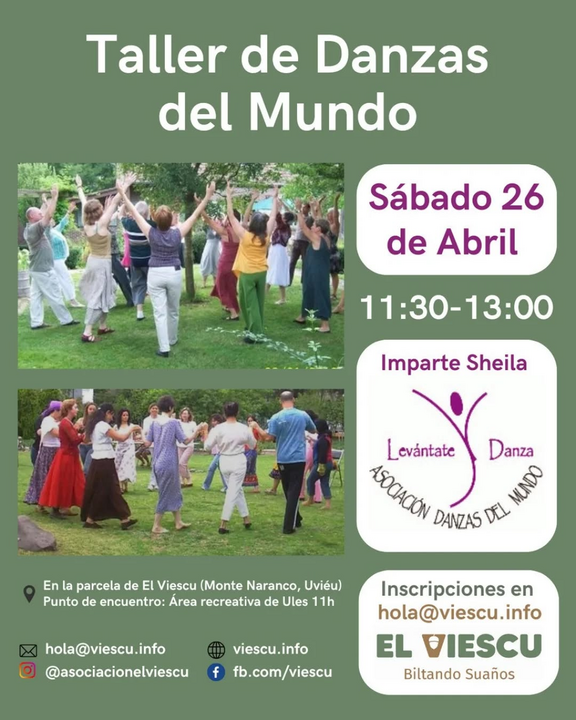 Se realizará en la parcela de la asociación el sábado 26 de abril, de 11:30 a 13:00h. Lo imparte Sheila de la Asociación "Danzas del Mundo" y consistirá en la realización de danzas tradicionales de diversos países, bailadas en corro, pareja, o línea. Danzas para encontrarse y compartir, con pasos sencillos y asequibles para todo el mundo.