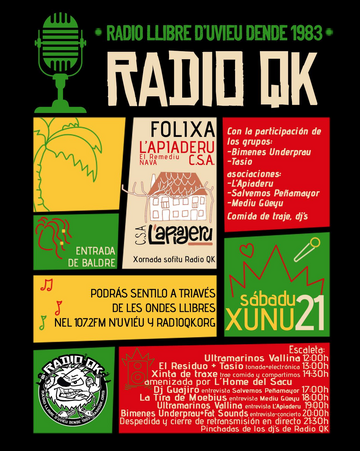 Dende Radio QK vamos averándonos al dia del eventu radiofónicu nel Remediu y apetecianos que vinieseis. Vamos tar nel CSA L'Apiaderu, asina que que meyor que vengais en tren. Ye una idega claro. Vosotres veni-y. Ya sabeis, el sábadu 21 dende les doce en direutu, va ser una experiencia. Pa tolo demás, 107.2 de la frecuencia modulada o www.radioqk.org/.