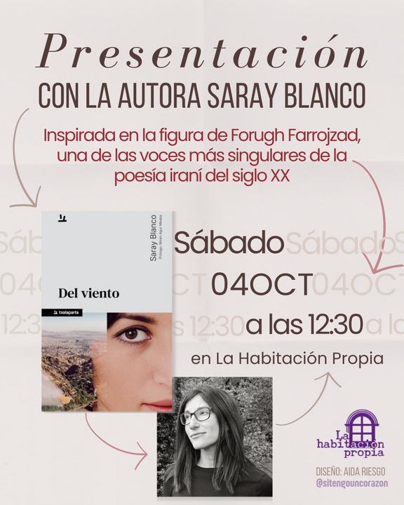 Siguiendo en nuestro afán por visibilizar escritoras de otras culturas y territorios, El sábado 4 de octubre presentamos un libro inspirado en la vida de la poeta iraní Forugh Farrojzad, quien vivió en el Irán occidentaizadodel último Sha, desafiando con sus escritos una sociedad profundamente injusta y patriarcal.