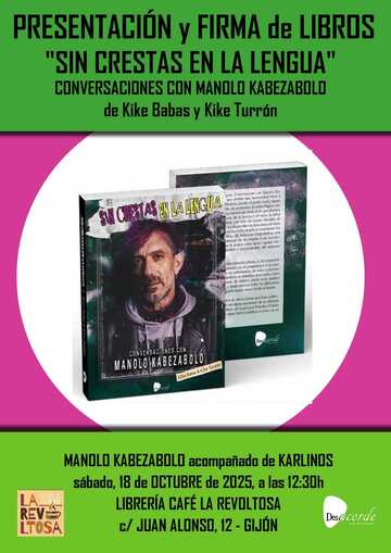 Sin crestas en la lengua. Conversaciones con Manolo Kabezabolo. Un libro que destila una honestidad feroz y una crudeza sin paliativos, donde el punk maño repasa al detalle su biografía, sin postureos ni subterfugios, encarando su quijotesca trayectoria vital, en la que destaca, más allá de la tramoya de la locura y el vicio, la labor incesante de un artista con más de cuatro décadas de carrera, empecinado en desarrollar su obra musical, tarea no siempre sencilla en una vida donde se entrelazan los episodios esperpénticos, de bohemia tragicómica, con las mieles y los parabienes de un respeto y un reconocimiento público que le avalan como autor capital, emblemático, imprescindible e intransferible del universo punk estatal.