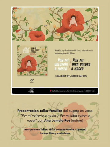 "La presentación-taller de Por mí volvería a nacer/ Por mi diba volver a nacer no es una presentación al uso, sino un taller familiar donde entre todas las familias crearemos un pequeño libro relacionado con las ilustraciones de Patricia Sáez Roza y los textos del cuento en verso que os voy a presentar.