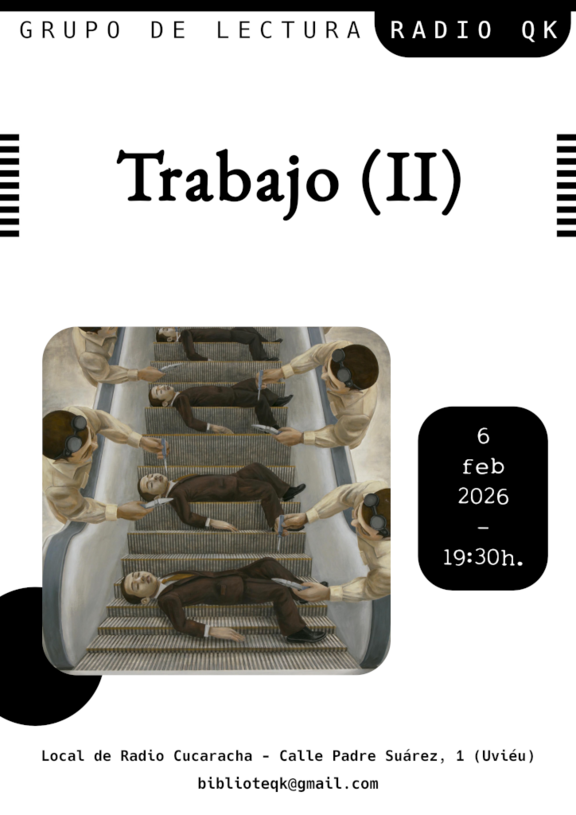 Como la anterior sesión se quedó corta para un tema que da tanto que hablar, en el Grupo de Lectura de Radio QK continuamos ahondando en el trabajo en toda su amplitud: su nocividad, la dependencia de él, la autoexplotación, sus viejas y nuevas formas...
