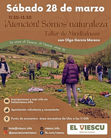 A las 11:30h comienza el taller de Mindfulness, impartido por Olga García Moreno, en el que intentaremos hacer un primer acercamiento a la atención plena y la apreciación estética de la naturaleza con el fin de ir eliminando la idea de "frontera" entre los seres humanos y la naturaleza, para poder entender la frase "tú eres el Viescu, el Viescu eres tú".