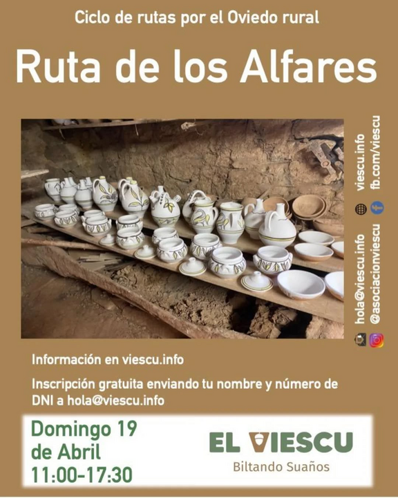 Con el cambio de horario comienzan los días largos y vuelven las salidas por el Oviedo rural de día completo. El domingo 19 de abril, de 11:00h a 17:30h, volvemos a intentar la ruta de los Alfares, que el otoño pasado tuvimos que cancelar por calor. Apuntamos al nordeste para ir caminando por Abuli, Los Molinos y San Cipriano de Pando hasta llegar a Faro, pueblín famoso por una cerámica cuya tradición ya viene de la época medieval. Volveremos por Faro de Arriba y Nonín para completar el recorrido de 15 km justitos.