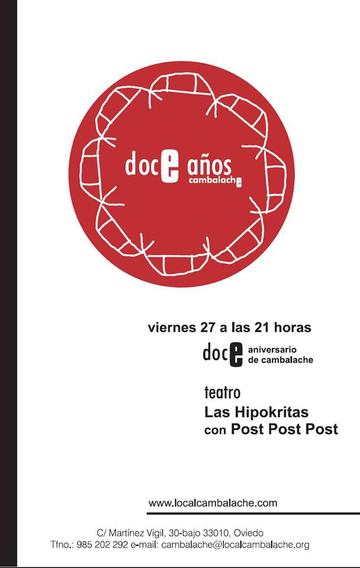 Parece mentira cómo pasa el tiempo, pero Cambalache cumple este mes de marzo 12 años... Para celebrarlo, os proponemos una asamblea a las 19h, para compartir en qué andamos enredadxs y cuáles son nuestros próximos proyectos, y después, a las 21h, nos echaremos unas risas con una actuación de teatro: Post-post-post, de la compañía madrileña Las hipókritas. Para terminar, disfrutaremos de la comida que traigamos entre todxs. Cambalache sólo es posible gracias a la gente, así que, ¡os esperamos!