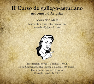 El Asociación Mezá vei impartir entre os meses d'abril y de mayo de 2015 un curso de gallego-asturiano de nivel básico en Uvieo, nel local Cambalache (La Cuesta la Noceda, 30). Este curso vei presentarse el día 7 d'abril ás 19:00 y ten úas tasas de matriculación de 20€, qu'incluyen os materiales y as 16 horas de clases nas que vei tar dividida el actividá: dúas horas al día, un día por semana.