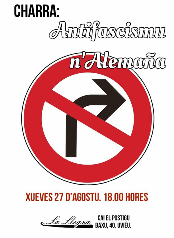 Esti xueves a les 18:00 vamos recibir en La Llegra la visita d'unes compañeres alemanes que lleven varios díes conociendo la realidá del nuestru país, pero esta vez van ser elles les que nos cuenten algo: van falanos sobre'l movimientu antifascista n'Alemaña, la problemática de la inmigración/refuxaos y los grupos radicales.