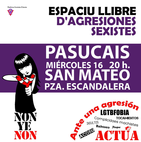 Por ello, desde la Plataforma Feminista d'Asturies lanzamos por segundo año la campaña "Por unas fiestas de San Mateo libres de agresiones sexistas y LGTBfóbicas", consistente en: