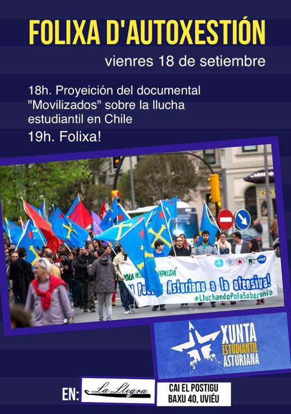 El vienres 18 de setiembre dende la Xunta Estudiantil Asturiana entamamos una nueva xornada na que compaxinar formación, alderique y folixa. Entamaremos a les 18:00 cola proyeición de "Movilizados", alrodiu'l movimientu estudiantil chilenu, les sos demandes y lluches, dende una visión crítica pa col modelu educativu esistente.