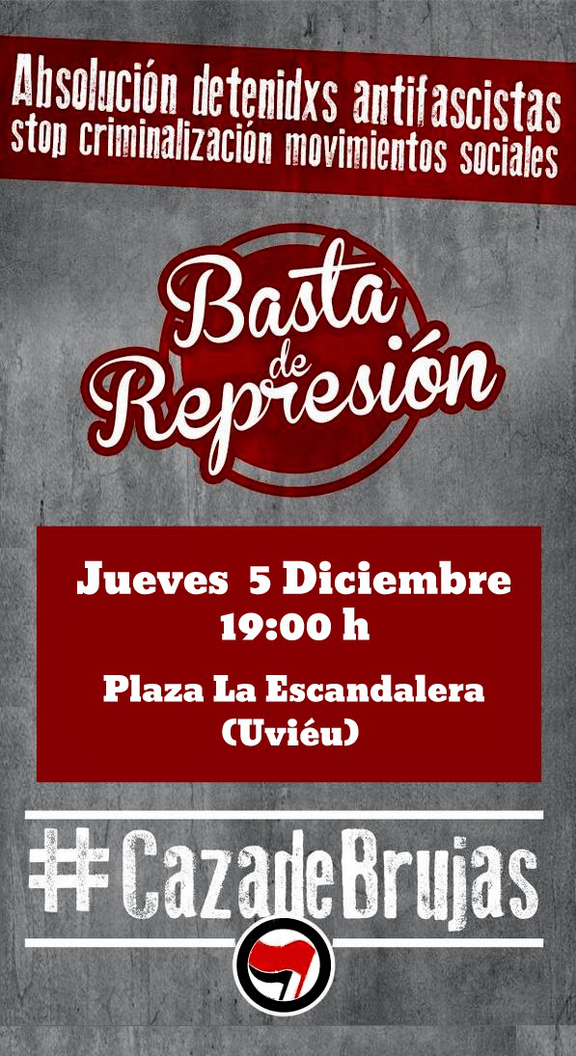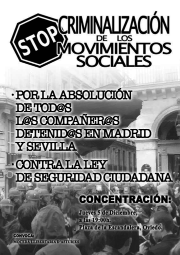 Como muchos ya sabréis en Madrid se están llevando a cabo multitud de detenciones a compañer@s del sindicato así como a estudiantes, por la simple razón de acudir a una manifestación en contra del fascismo el pasado 20 de Noviembre. Por esa razón desde las Juventudes Libertarias se ha decidido realizar una concentración en solidaridad con est@s compañer@s represaliad@s elJueves día 5 de Diciembre en Oviedo a las 19:00 en la plaza de la Escandalera.