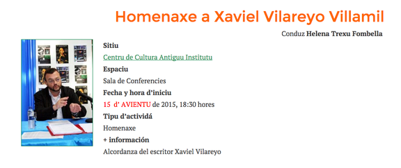 Dientro les Xornaes de l'Arribada va tener llugar un homenaxe, entamáu por Helena Trexu, al escritor y músicu Xaviel Vilareyo que morrió mui ceo en mayu d'esti añu.