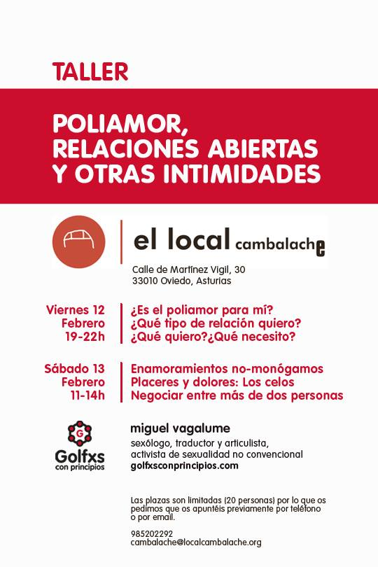 El viernes 12 y el sábado 13 de febrero, organizamos un taller sobre poliamor, relaciones abiertas y otras intimidades, dinamizado por Miguel Vagalume (golfxs con principios).