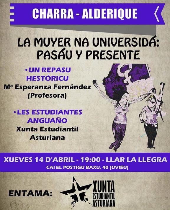 El xueves 14 d'abril a les 19:00 la Xunta Estudiantil Asturiana entama nel Llar La Llegra (Cai El Postigu Baxu, 40) la charra-alderique "La muyer na universidá: pasáu y presente". Na mesma vamos cuntar cola participación de la profesora Mª Esperanza Fernández, que va facer un repasu hestóricu alrodiu'l papel de la muyer nel mundo universitariu, y la so evolución. Xunto a esta cuestión, la XEA va facer tamién la so intervención alrodiu la situación de les muyeres estudiantes anguaño, les sos problemátiques y puntos de llucha.