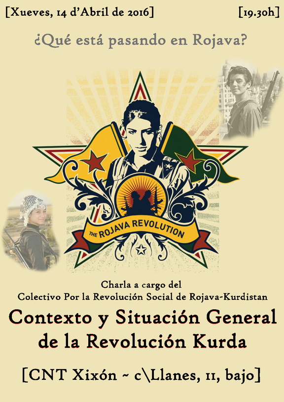 El Colectivo por la Revolución Social de Rojava-Kurdistán recala en Xixón para darnos una visión directa de las experiencias autogestionarias, feministas y revolucionarias que están sucediendo en el Kurdistán Sirio y que son silenciadas por los medios de comunicación a pesar de hallarse en mitad del mayor conflicto geopolítico actual y ser una auténtica línea de defensa contra el avance de las teocracias. El confederalismo democrático, los grupos de autodefensa, la ecología, la liberación de la mujer y el colectivismo son algunos de los pilares claves sobre los que nos hablarán los compañeros venidos para la ocasión.