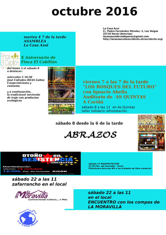 Recordad: sábado 8 de octubre, desde las 6 de la tarde, en nuestro local de la c/ Pedro Fernández Méndez, 2 y, si el tiempo lo permite fuera del local, en el prao, delante mismo, Abrazos de otoño.