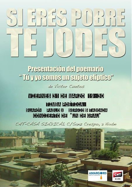 Este próximo 31 de Marzo, viernes, a las 19:30, en la Casa del Pueblo, presentación del poemario de Víctor Cuetos "Tú y yo somos un sujeto elíptico".
