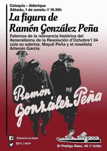 El sábadu 1 de xunetu, nel Llar La Llegra (El Postigu Baxu, 40) cuntamos cola presencia de Mayuli Peña, sobrina de Ramón González Peña, y del novelista Artemio García p'aldericar sobre la figura del Xeneralísimu de la revolución asturiana d'Ochobre'l 34.