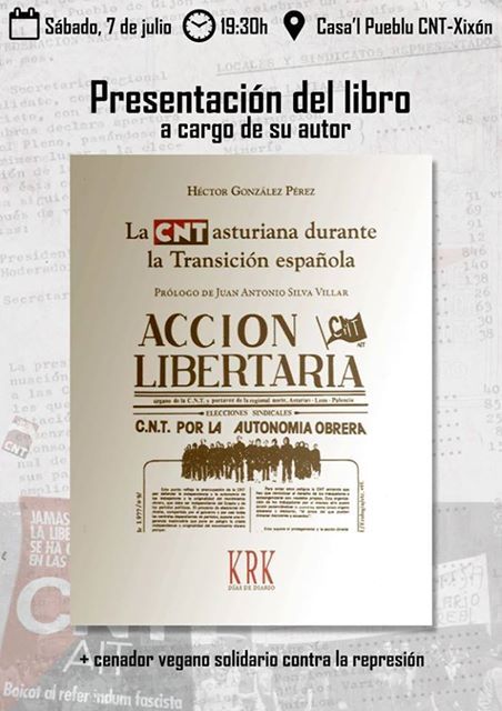 A las 19:30 presentamos "La CNT asturiana durante la transición española", libro de nuestro compañero Héctor González que aborda de uno de los periodos más interesantes e inexplorados de la CNT.