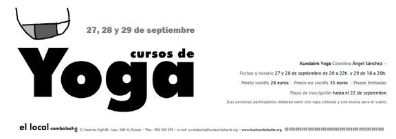 El miércoles 27, el jueves 28 de 20 a 22h y el viernes 29 de septiembre de 18 a 20h. Curso de Kundalini Yoga. Coordina: Ángel Sánchez. Plazas limitadas. Matrícula: socixs 28 euros y no socixs 35 euros.