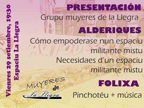 Una de les cuestiones coles que mos estrenamos nes actividaes abiertes va ser un alderique sobre la llucha feminista y la militancia n'espacios mistos, pola mor de crear un puntu d'alcuentru pa reflexonar, visibilizar y proponer aquelles coses que necesitamos camudar y que camuden.