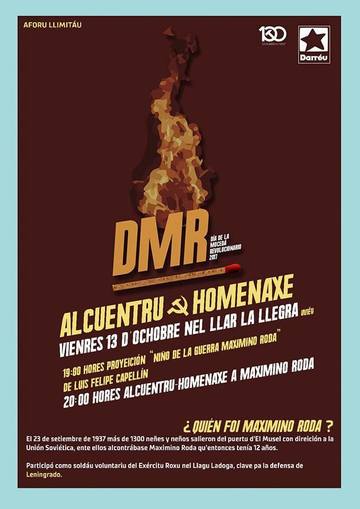 Un añu más llega'l DMR, y esti añu entamará'l vienres 13 con una proyeición y alcuentru-homenaxe con Maximino Roda (neñu de la guerra y combatiente del Exércitu Roxu) dende les 19:00 nel Llar La Llegra.