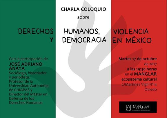 JOSE ADRIANO ANAYA, profesor de la U. Autónoma de Chiapas, sociólogo, historiador y periodista, y Director del Máster en Defensa de los Derechos Humanos, impartirá una charla sobre "Derechos Humanos, Violencia y Democracia en México", el próximo martes, día 17 de octubre, a las 19:30 h. en El Manglar Ecosistema cultural (C/ Martínez Vigil, 14. Oviedo).