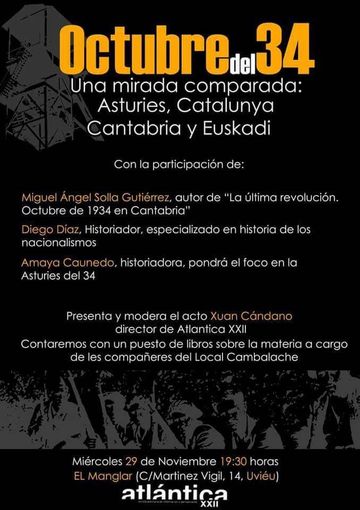 El miércoles 29, la revista Atlántica XXII, organiza en El Manglar este acto sobre los acontecimientos de octubre de 1934 desde una mirada comparada a los territorios donde el movimiento revolucionario tuvo mayor intensidad.