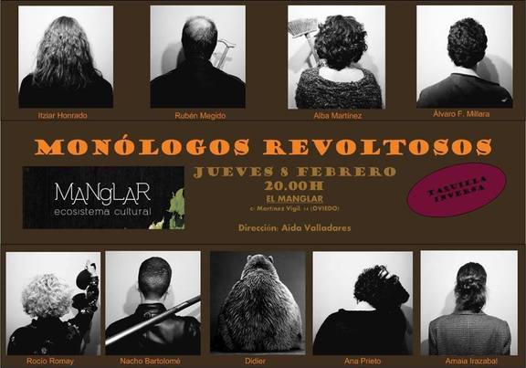 "Monólogos Revoltosos" es una selección de monólogos de creación propia o extraídos de obras literarias o películas. Son nueve monólogos que, a través del drama o la comedia, buscan remover almas y conciencias. Desde Segismundo, pasando por un nazi, una yonki, una feminista, un zoofílico, una choni, un anarquista, una funcionaria o incluso Virginia Wolf podremos ver un retrato de la sociedad que no nos dejará indiferentes. Nueve actores y actrices dirigidas por Aida Valladares.