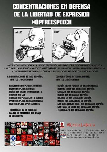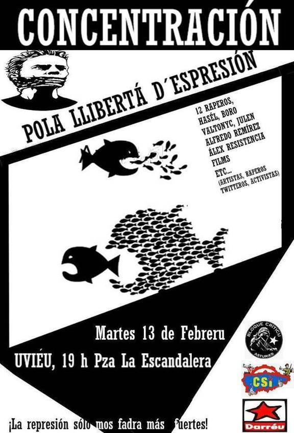 Día 13 a les 19,00 na Escandalera sumámonos a les concentraciones nacionales de sofitu a toles represaliaes por esti réximen, dende artistas a raperos, de twitteros a periodistas etc ¡ Porque la so represión sólo mos fadra más fuertes!